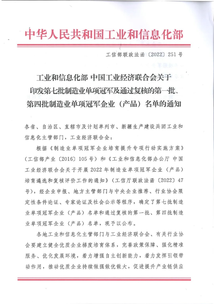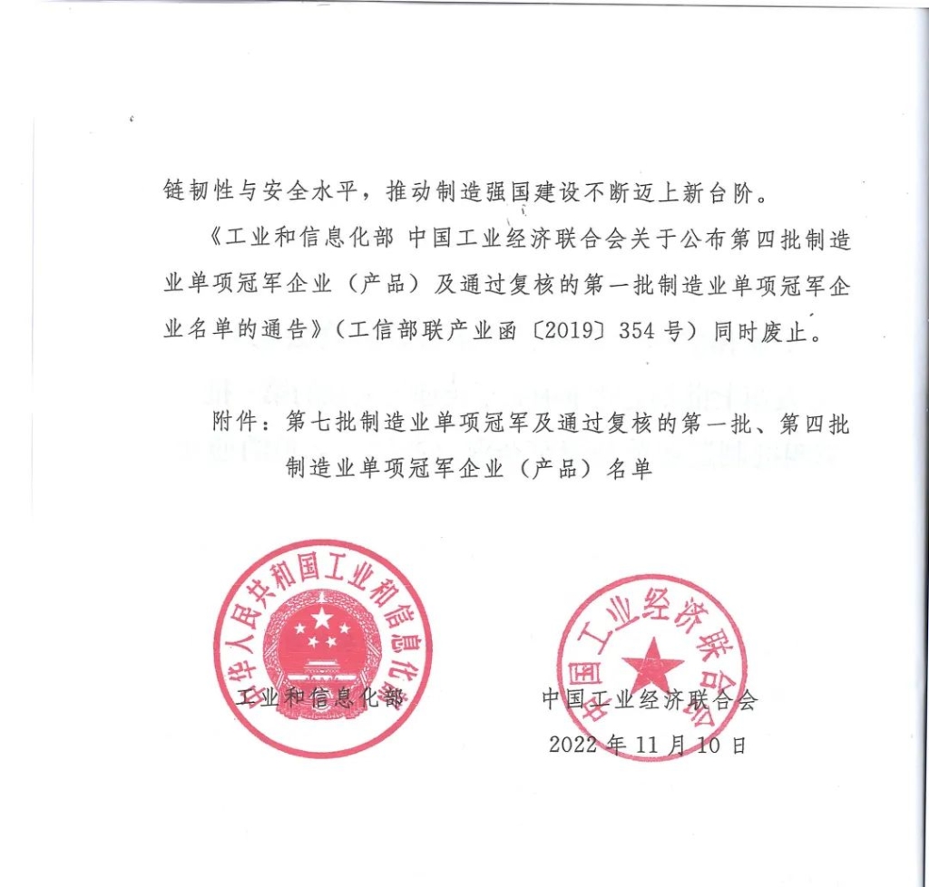 日前,工業(yè)和信息化部、中國工業(yè)經濟聯合會發(fā)布了《關于印發(fā)第七批制造業(yè)單項冠軍及通過復核的第一