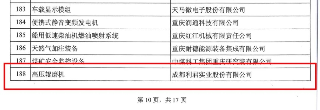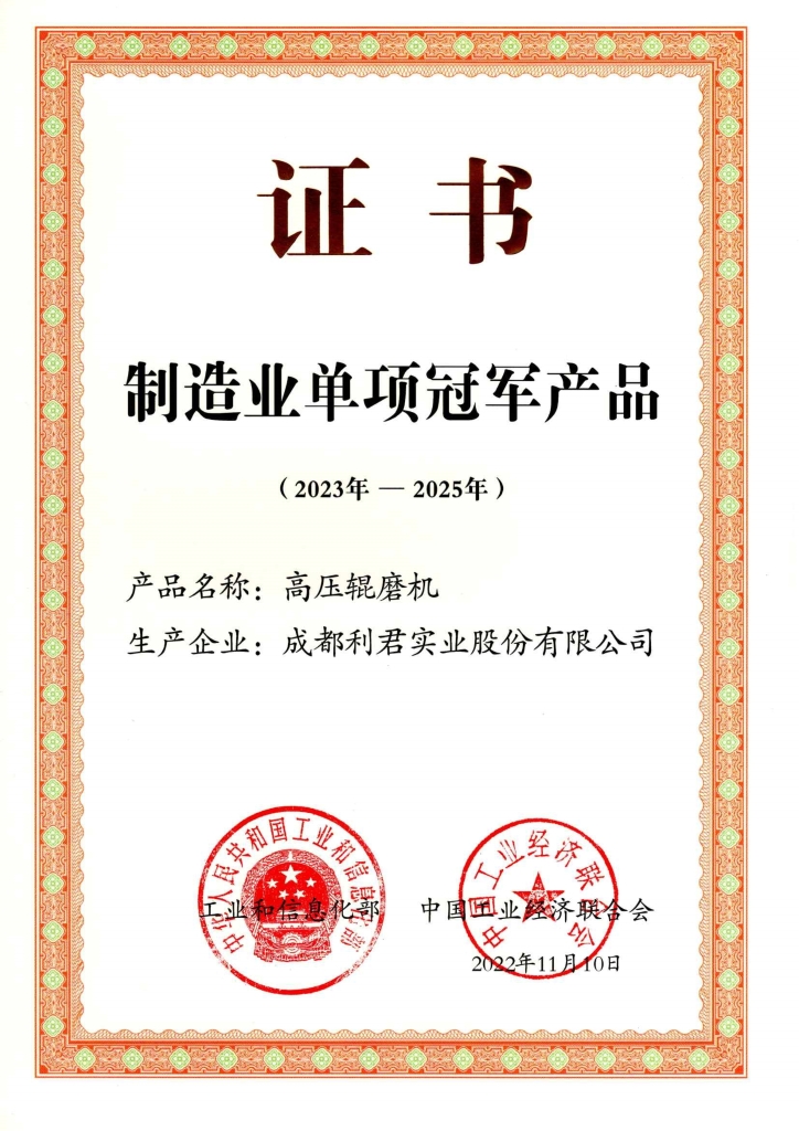 批、第四批制造業(yè)單項冠軍企業(yè)(產品)名單的通知》,成都利君實業(yè)股份有限公司(以下簡稱“公司”)產品“高壓輥磨機”入選為第七批制造業(yè)單項冠軍產品